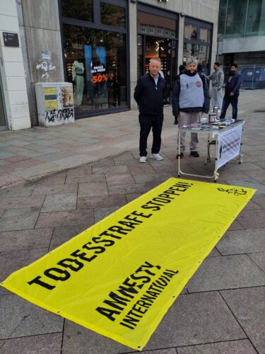 Seit 2003 wird international der Welttag gegen die Todesstrafe begangen. Und so waren wir auch in diesem Jahr wieder aktiv und vor dem Rathaus auf dieses Thema aufmerksam gemacht. Die diesjährige Aktion fand in Kooperation mit der Initiative gegen die Todesstrafe und einem Vertreter der iranischen Bewegung statt, dieser berichtete von der massiv gestiegenen Zahl von Hinrichtungen im Iran, die auch Verwandte von Menschen aus seiner Gruppe betreffen. Gemeinsam standen wir für eine weltweite Abschaffung der Todesstrafe ein. Nähere Infos unter https://www.amnesty.de/todesstrafe-hinrichtungen-fakten-faelle-hintergruende