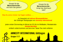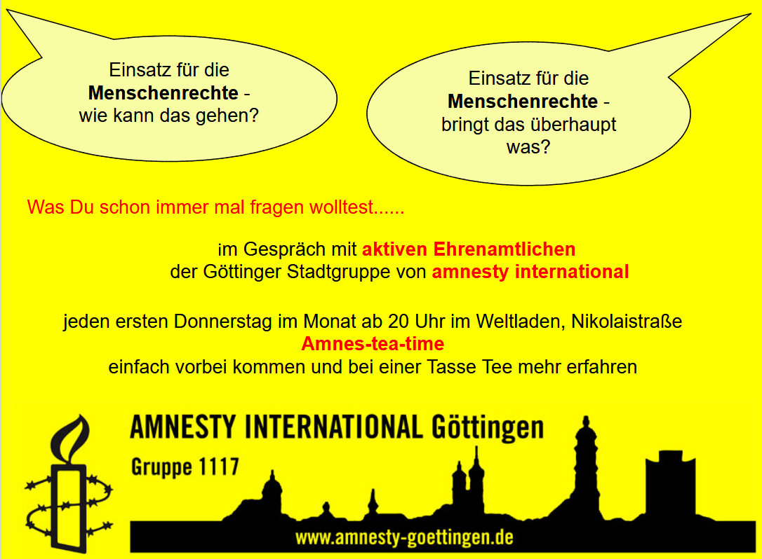 - Per E-Mail allgemeine Anfragen an:kontakt@amnesty-goettingen.de -> Anfragen zur Menschenrechtsbildung: bildung@amnesty-goettingen.de